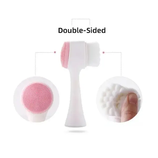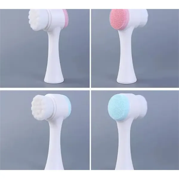 Elevate your skincare routine with our dual-ended facial cleansing brush. One end features a soft silicone brush for gentle exfoliation, while the other end boasts microfiber bristles for deep cleansing. The set also includes a silicone exfoliator brush head designed to massage oily T-zones and clear clogged pores. Simply rinse the brush under warm water, apply your favorite cleanser, and gently massage your skin in circular motions to remove dirt, oil, and makeup residue. Suitable for all skin types, this versatile tool is a must-have for effective and soothing skincare. Dimensions: 5 1/8"L x 2 3/8"W x 1 3/4"H.