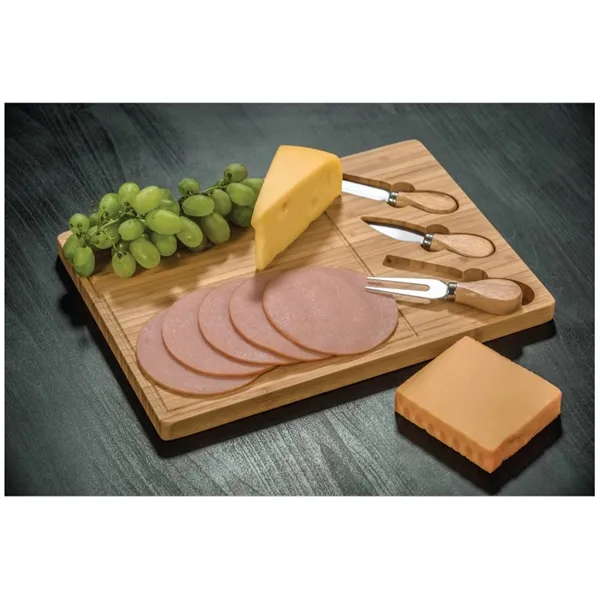 Timeless bamboo cheese board set with 3-piece knife set. Compact design stores three cheese tools in the board. Includes a pointed tip cheese knife, cheese fork, and cheese chisel knife. Designed to be convenient and great for on the go picnics or parties. 13 3/4" W x 9 3/4" H x 3/4" H.