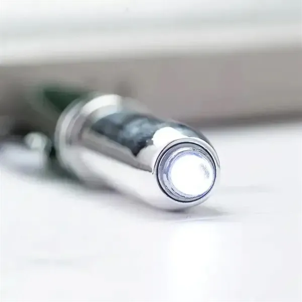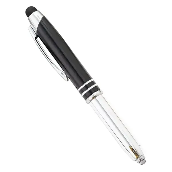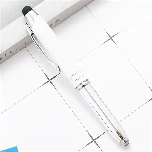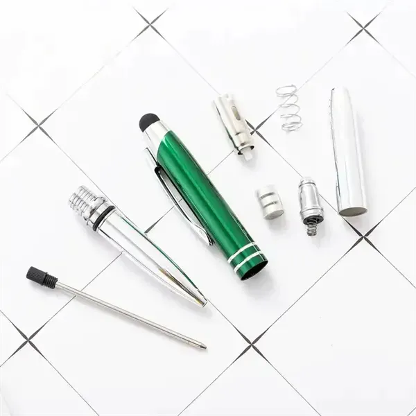 Durable aluminum construction, portable and stylish design. Includes LED flashlight and stylus. Features a short chrome barrel, colorful cap, and touchscreen-compatible capacitor. Ideal for daily life, office, school, and writing needs.