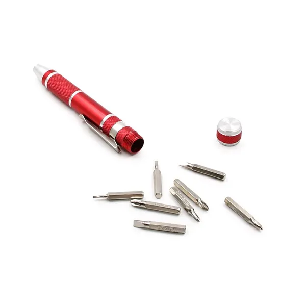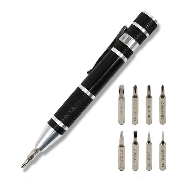 Take care of all kinds of quick fixes as home, work or on the road with this cool multi-tool that you can carry in your pocket. This 4 1/2" x 1/2" steel took has a pen-shape with a handy pocket clip. Unscrew the top to reveal eight bits -- 1.5mm, 2mm, 3mm, 3.5mm flat head and PH00, PH0, PH1, PH2 Phillips head. Insert into the base to turn all kinds of screws. Available in gunmetal and blue. Add your school, sports team, organizational or company logo or message to customize.