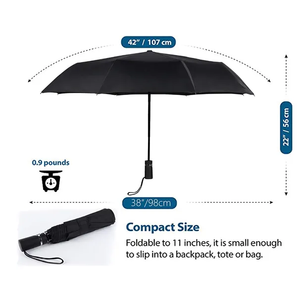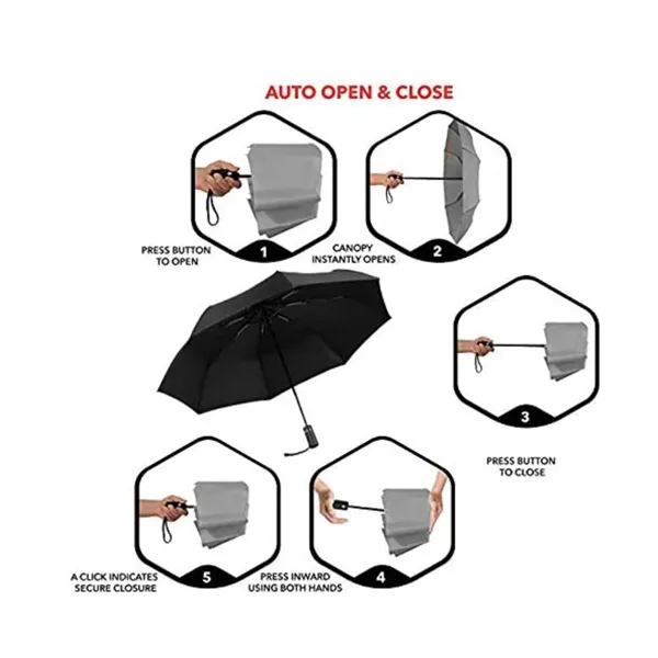 Premium quality, stainless steel, ultra-slim, windproof, travel Umbrella with easy open /close; 8-rib fortified frame; fiberglass flex clip; chrome plated metal shaft.Durability-Tested up to 5000 times; frame is wind-resistant up to 55 mph; resin reinforced ribs will not bend or flip out in strong gusts; stainless steel frame will not corrode in constant presence of water or moisture.Umbrella canopy is made with 210T pongge and coated; it will not soak through or leak, even in torrential downpours; rubberized grip keeps the handle secure and slip-free in your hand.Auto open/close function allows for easy one handed operation. Measures just 13" long and weighs less than 12 oz for easy storage in purses, briefcases, backpacks, luggage and more!