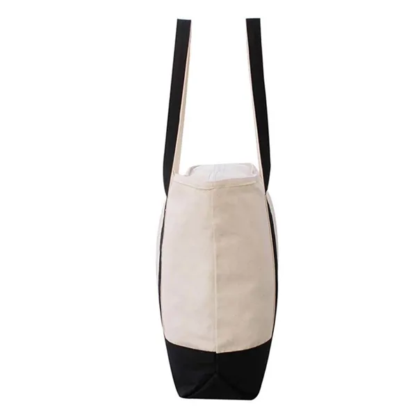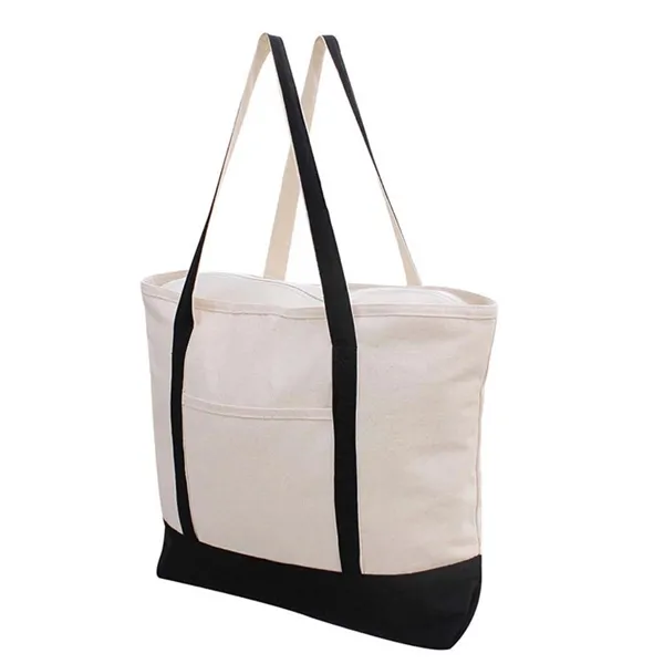 Made of 100% Cotton Canvas and classic boat tote bag. Spacious main compartment, a large front pocket for carrying small items, sturdy handles,top zipper closure.23" W x 14" H x 7" D size. Many different color combinations to from. Perfet for daily use, shopping, beach, trade shows and other events!