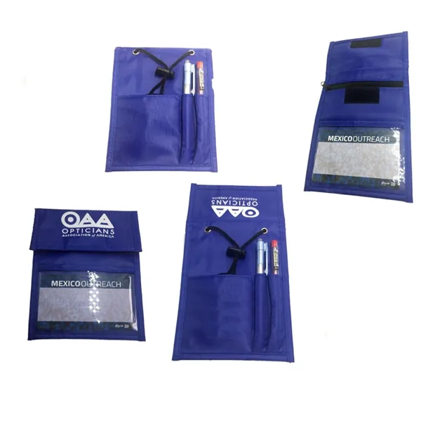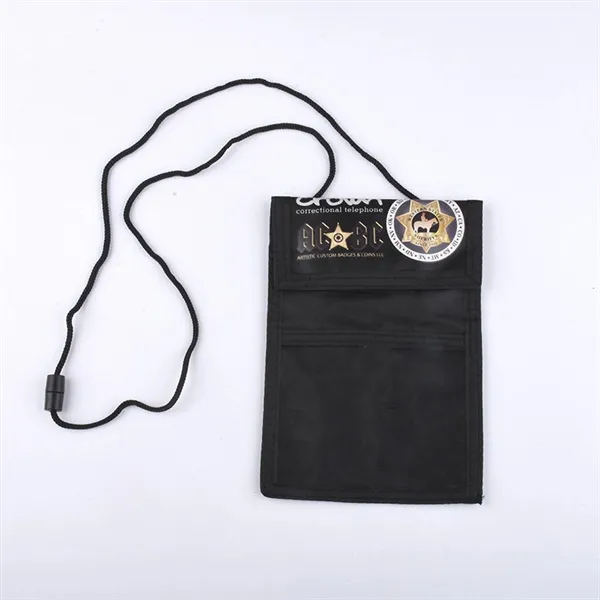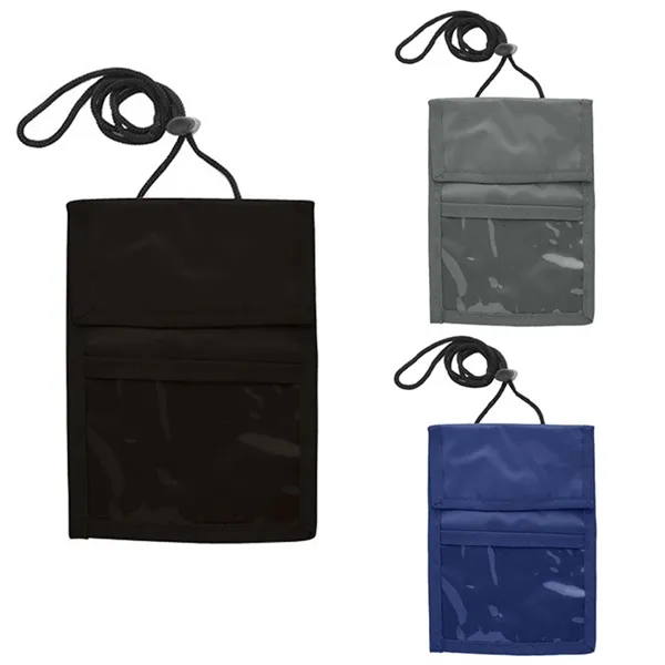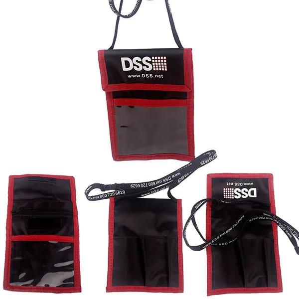 This folding neck wallet is made of high quality nylon material, this convention neck wallet with lanyard includes a clear plastic badge window, outside business card pocket and 2 pen loops, inside zippered compartment and adjustable breakaway safety neck cord, and black trim. It is a great promotional product for any trade show, annual meeting, seminar, or conference.