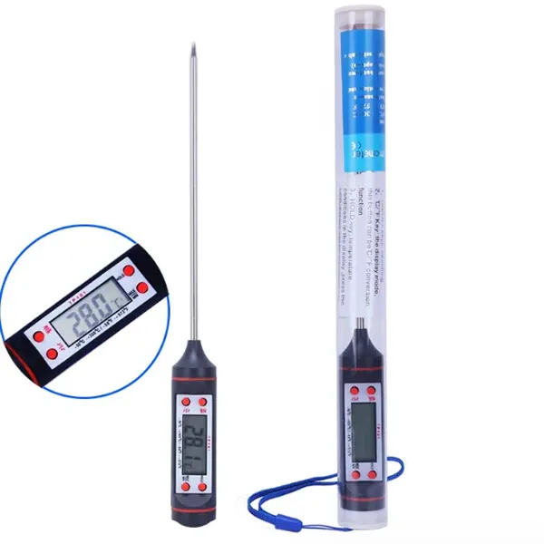 Effortlessly monitor food temperatures with our kitchen food thermometer featuring an LED display screen for easy reading. The thermometer offers a wide temperature range from -58AF to +572AF, with a 6-inch stainless steel probe. The instant-read feature ensures quick results, and the device automatically shuts off after 10 minutes to preserve battery life. The thermometer is versatile, suitable for measuring water temperature, food, milk tea, soup, and more. It comes with a replaceable AG13 button battery and instructions, conveniently packaged in a protective long tube. An essential tool for every household, measuring 9 1/16" in length and 1/2" in width.