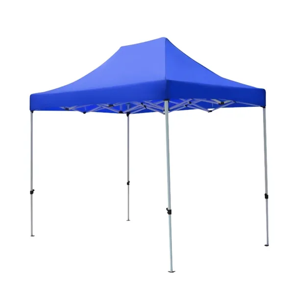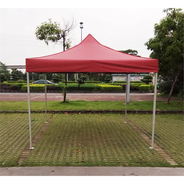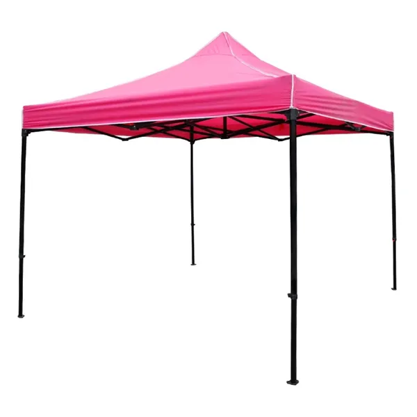 Create an instant oasis from the hot summer sun, or a promotional showplace at an indoor or outdoor event with this easy to set up gazebo!Your artwork will be imprinted on 400 denier polyester. Pebble powder-coated steel frame. ABS nylon joints. Crank-up canopy creates a taut, clean peak. Legs feature plastic push buttons for pinch-free height adjustments. Easy-Glide Tent Feet allow the tent frame to slide on dirt and grass, preventing the legs from catching. Stake kit and wheeled carry case included. One-year warranty on hardware.