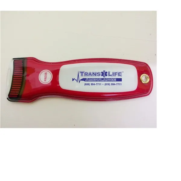 It has a big place to print your logo,2 non-replaceable lithium batteries with self life that last several years,magnetic back,momentray press on/release off switch and wrist cord