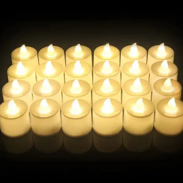 These flickering bulb flameless LED Tea Lights, perfect as mood or night lights. They fit beautifully in votive holders or glass cups. Each tea light includes a long-lasting battery with over 100 hours of light time, easily replaceable via a bottom tab. With no flame, they pose no fire hazards or burning risks, making them safe for homes with pets or children. Ideal for use on tables in restaurants, homes, gardens, and at weddings, parties, and festivals, these battery-operated tealights add a warm, inviting glow to any setting.