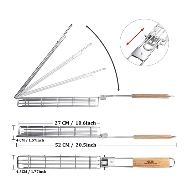 Set of 4 Kabob Grilling Baskets - Grill basket size :20" x 1.8" x 1.5", Grill Basket is made of heavy 18/8 Stainless Steel with long foldable Oak wooden handle.New Lock Design - Lockable grill grate locks foods in place and enable easy flipping of grilled foods.The space between the grids are perfectly sized to ensure even heat distribution.Not only do you save a lot of time, you no longer have to put your vegetables on the grill.Extremely Convenient - No need for skewers or the work involved to make kabobs. Vegetable Grill Basket Makes Grilling Easilier and Faster . This grill rack firmly holds sausages or other food in place and ensures it will not bend or break when you are the grill master.Easy Kebab Baskets - Grilling for shrimp, fish, seafood, vegetables, diced meat.