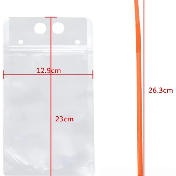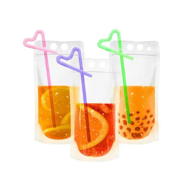 Enhance your outdoor activities with these eco-friendly, hand-held Stand Up Re-closable Zipper Drinking Pouches with Straw, made from PET PE MOPP. These safe and odorless pouches are suitable for both hot and cold drinks. Measuring 5 1/9" X 9" +1.5", they have a capacity of 500ml/17OZ. Features include heat sealability, round corners for safety, and a notch for easy opening. Perfect for camping, hiking, or beach outings, these clear pouches can hold drinks, candies, nuts, and more. Customize them with your logo for added brand visibility.