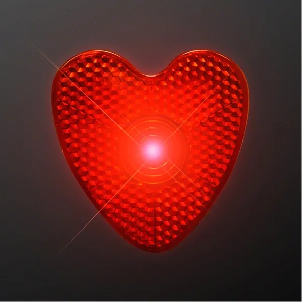 Heart-shaped flashing safety button keeps people aware of your presence and your brand. Red light blinks rapidly to bring attention to the logo. There is a click on/off button on the back. Includes 2 button cell batteries (inserted) not replaceable. Front panel is made of reflective plastic to bring added safety to user. Production times may vary due to imprint method. 2.25" W x 1.875" H x 0.625" D