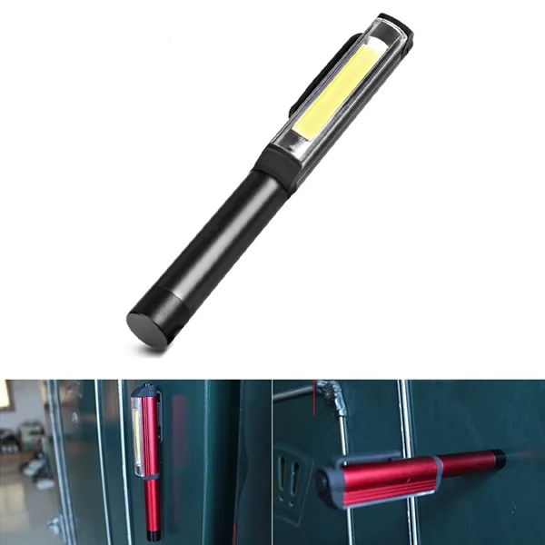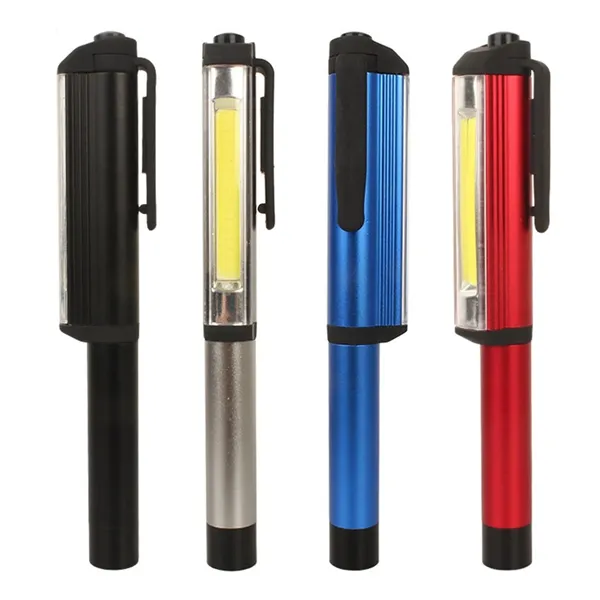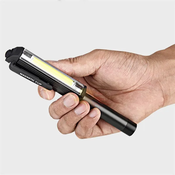 Advertise your brand with this COB Inspection LED Light. Illuminate workspace on-the-go by investing in this COB pocket work light. Both top light and front light is 3W. Powered by 3pcs AA battery for each light. The size is 7.87" X 1.57" X 0.98". It is also equipped with a strong magnetic clip to give you a hands-free lighting experience by attaching it to magnetic surfaces.The clip also is able to remove within 120 degree. It is designed with a reinforced plastic body for shock-proof and water resistant abilities. The light has 3 modes, 100% light, 50% light and flash. This is a great gift for the do-it-yourselfer and handy person. Powered by battery. Imprint your brand name or custom logo on product for maximum brand exposure and market your brand like never before! Price is by sea.