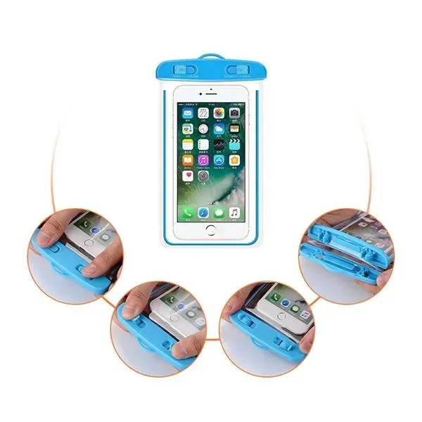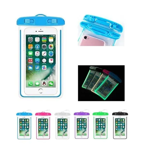 This waterproof phone bag, crafted from premium PVC with luminous strips, features a neck halter cord for easy carrying. Ideal for use at swimming pools or beaches, it also offers customizable logo space on the bag.