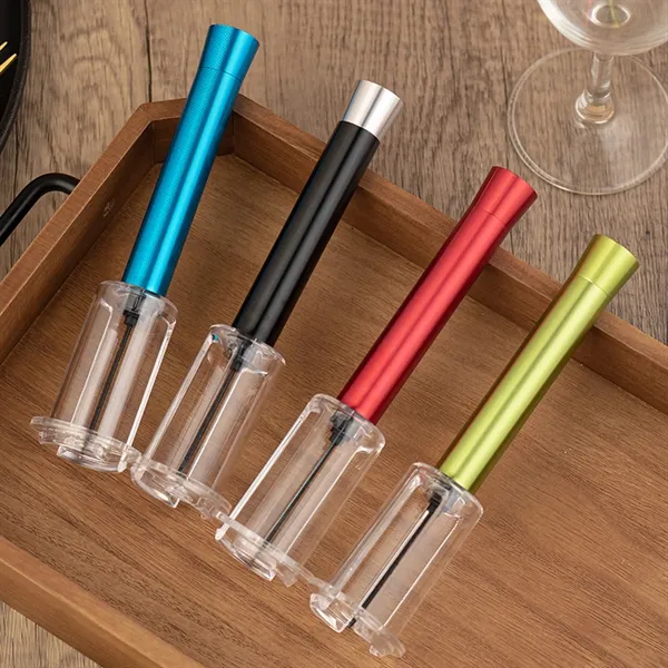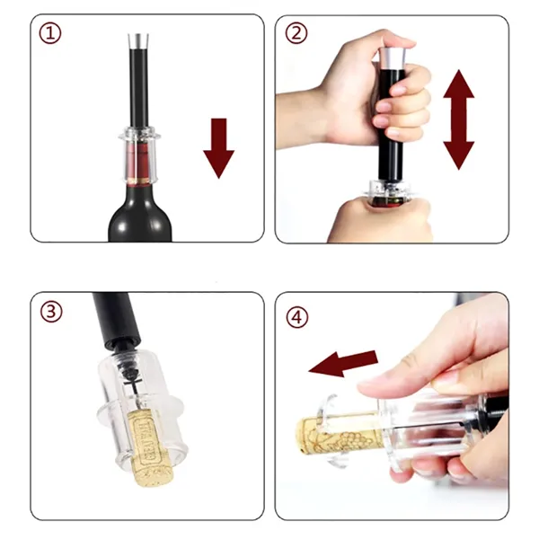 Pop the top on your new marketing plan with this manual air pressure wine opener! The pressure wine opener utilizes a vacuum pressure principle and is fast and easy to operate. It features a pressure corkscrew needle that goes into the middle of the cork and a plastic protective sleeve to protect the bottle. Users simply put air into the bottle with an up and down motion until the cork slides from the bottle. This air pressure bottle opener should not be used to open soda or sparkling-type wine like champagne.