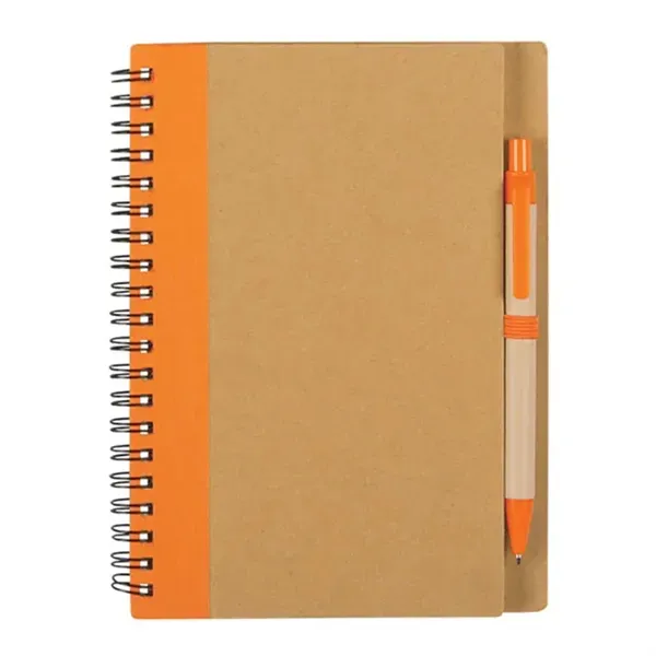 Boost your brand with the eco-friendly 5" x 7" spiral notebook and pen! This stand out spiral notebook has 80 lined pages ad features an elastic pen loop, elastic band closure, and a matching pen with a recycles paper barrel with a wooden clip. Available in a variety of colors, imprint of your logo or company name will make a lasting impression. Choose this great giveaway for your next tradeshows, conventions, and even training seminars!