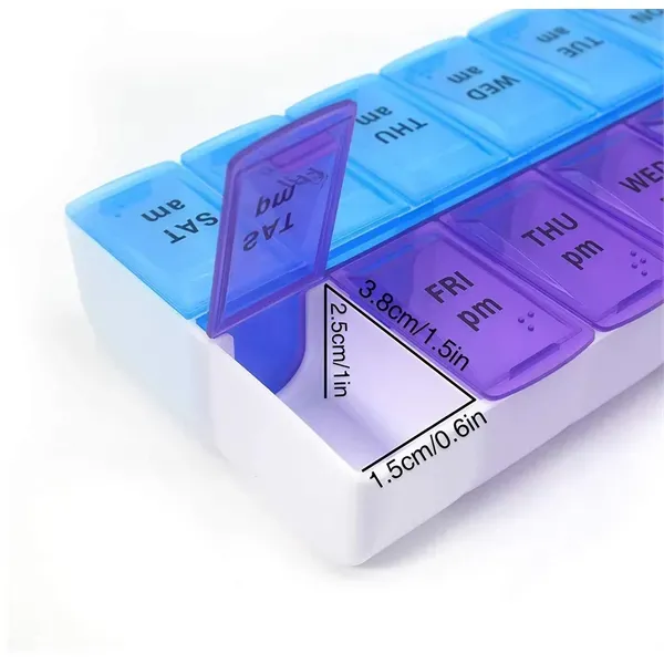 This PP pill container features 14 compartments labeled with days of the week in two colors for day and night doses, aiding daily medication management. Measuring 7.25" L x 3.5" W, it offers convenient and safe pill storage. Extra charges may apply.