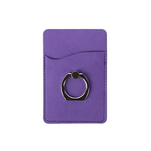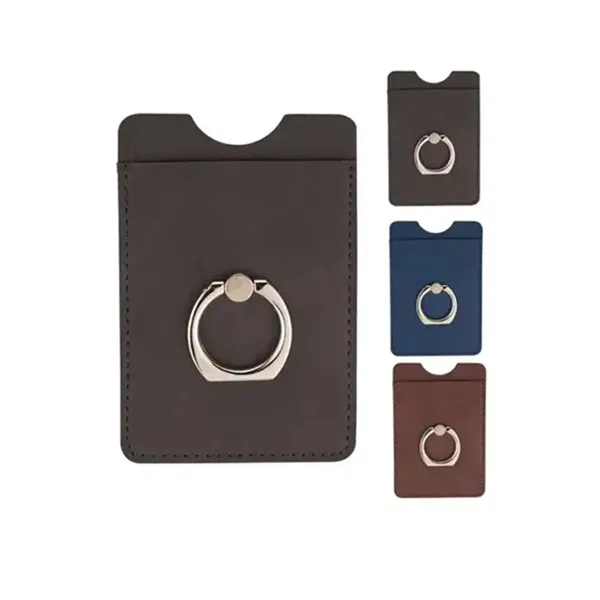 This versatile card holder with a metal ring phone stand. Crafted from polyurethane leatherette, it features a smartphone pocket with a rotating metal ring on the back, instantly transforming it into a convenient stand. The removable adhesive back securely attaches to smartphones, cell phones, or mobile devices without leaving residue. This single pocket serves a dual purpose as a wallet, accommodating transit cards, credit cards, IDs, and business cards. It#039;s a practical and stylish accessory that ensures your brand gets noticed.
