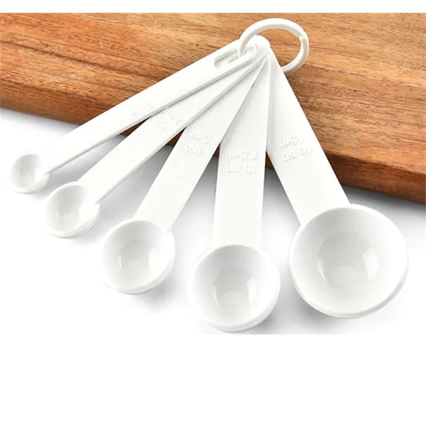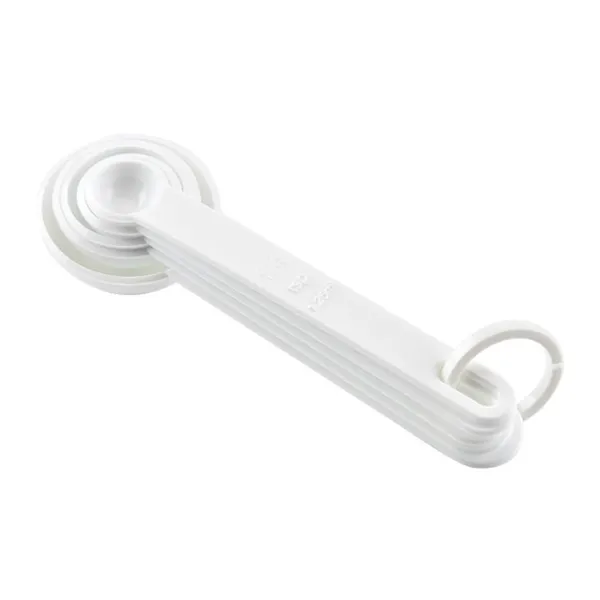 This measuring set includes 5 different spoon sizes, 1 tablespoon (15 milliliter), 1/2 tablespoon (7. 4 milliliter), 1 teaspoon (5 milliliter), 1/2 teaspoon (2.5 milliliter), and 1/4 teaspoon (1.25 milliliter). These measuring spoons work with both wet and dry ingredients. Crafted from durable,PP plastic, each spoon has its size printed in easy to read letters on its handle in both standard and metric units. The measuring spoons nest within each other and are held together with a thick plastic ring to secure easy organization and storage.