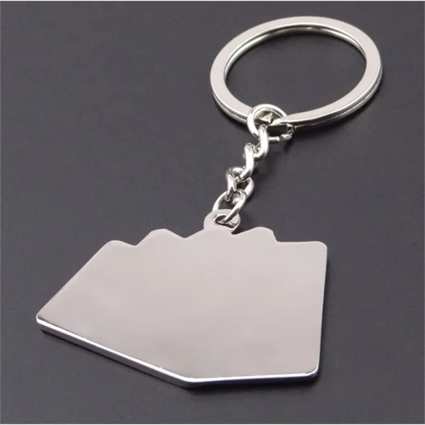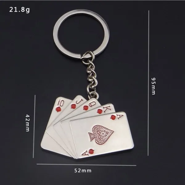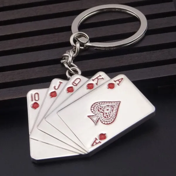 A satin metal key chain in the shape of playing cards making a royal flush in poker. Great for casino games, Las Vegas and trade show promotions. Imprint on one side only. For permanent imprint, this item is laser engraved.