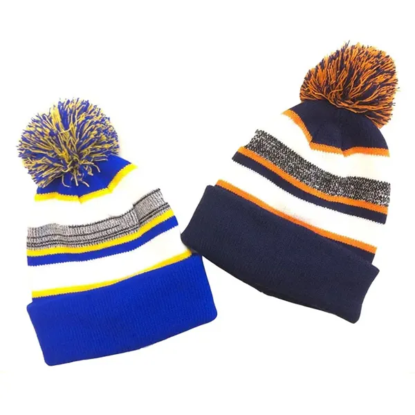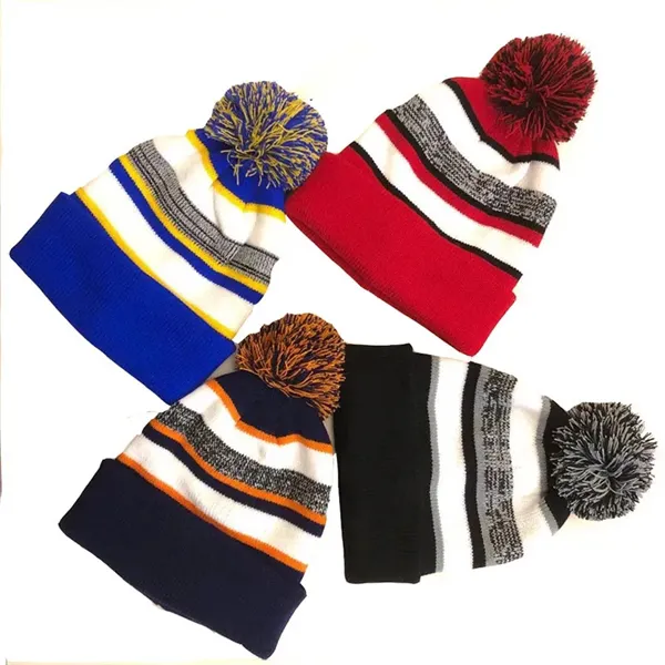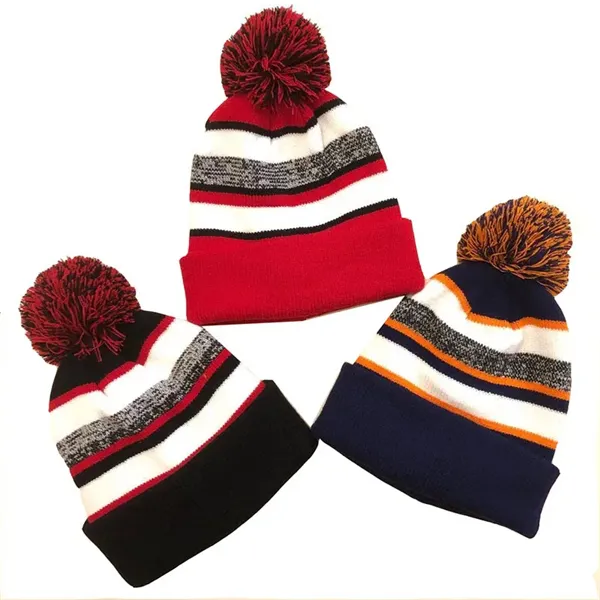 Stay warm and stylish with this knit acrylic beanie. It features a colorful single-stripe design and a playful pom-pom on top. The generous cuff offers versatility in styling. Available in eight color combinations, it can be customized with your emblem or message through our signature embroidery process. Ideal for ski clubs, winter sports fans, campus gift shops, and more, this beanie is perfect for keeping cozy while showcasing your brand or cause.