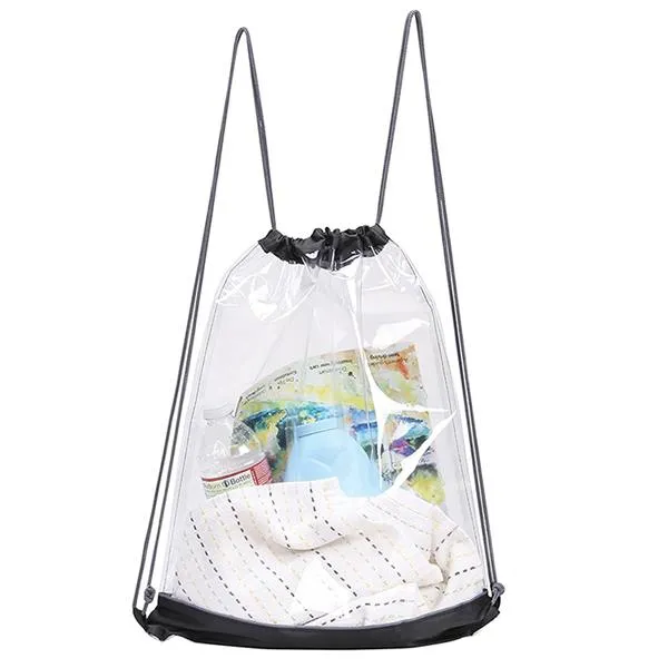 Give your clients a backstage pass to your logo with this resuable drawstring backpack! The clear PVC drawstring backpack features black nonwoven trim and a shoulder strap that doubles as a drawstring cinch-up closure.It#039;s made using vinyl with 80GSM non-woven polypropylene trim. With the clear material, this bag is ideal for sporting events, college campuses, the workplace and many more events and venues. Make a lasting impression on clients once it#039;s imprinted with your logo or company name!