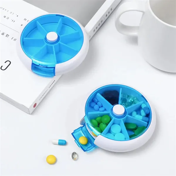 This round, 7-day pill holder is a compact and convenient solution for daily medication management. With individual compartments for each day, it ensures consistent dosage. The box rotates with a simple push-button mechanism for easy pill dispensing, and the cover removes for quick refills. It#039;s perfect for travel and can be customized with your logo to impress new customers.