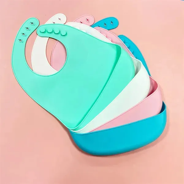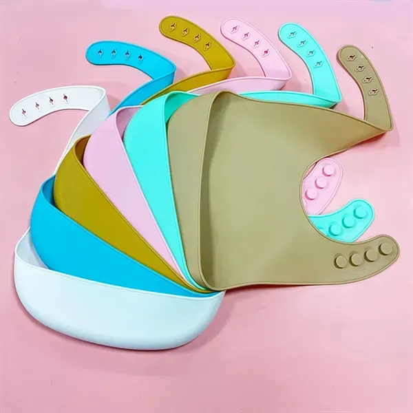 Made of 100% silicone material. Comes with an adjustable collar and a food catcher to catch falling food crumbs and drink spills. Washable and reusable. Just empty the pocket and clean it off. 9" W x 11 4/5" H
