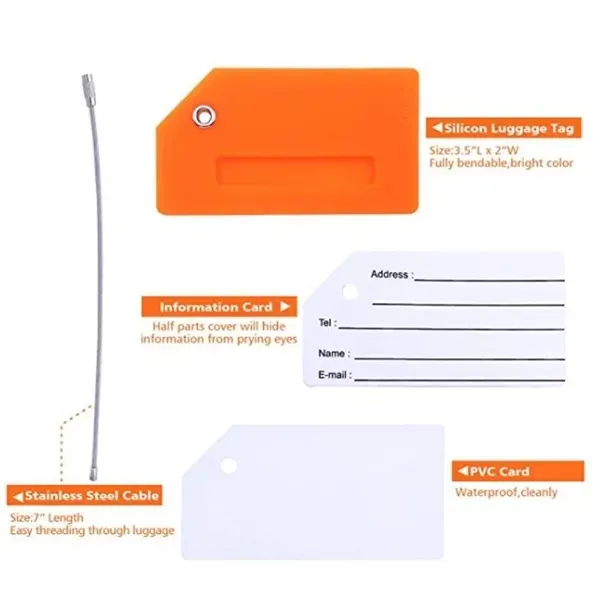 This durable, flexible silicone luggage tag is lightweight and small (Tag: L3.5 x W2 inches, Name card: L 3.4 x W1.8 inches) for easy travel. Available in multiple colors: red, black, blue, green, orange. Its steel loop ensures easy attachment and secure connection to your luggage.