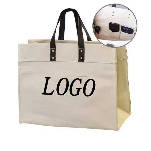 The Montauk tote is a classic box tote with a modern twist. It measures 20"W x 13"H x 6"D and is crafted from 24 oz. natural canvas. This tote boasts a spacious main compartment, vegan leather handles, and an interior hanging pocket with a zippered compartment for secure storage of personal items. It#039;s a promotional item that offers both style and practicality, sure to be used repeatedly!