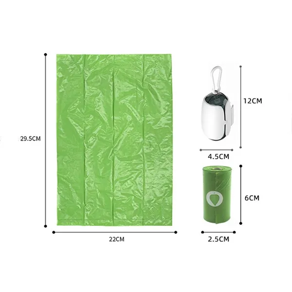 Dog poop bag dispenser with carabiner easily attaches to leash or belt loop. Refillable compartment holds 20 disposable dog waste bags. Fits most store purchased bag refills. Includes 20 disposable bio-degradable bags (bag size: 8" x 12 3/4"). Ideal for pet stores, veterinarians, groomers and dog shows.