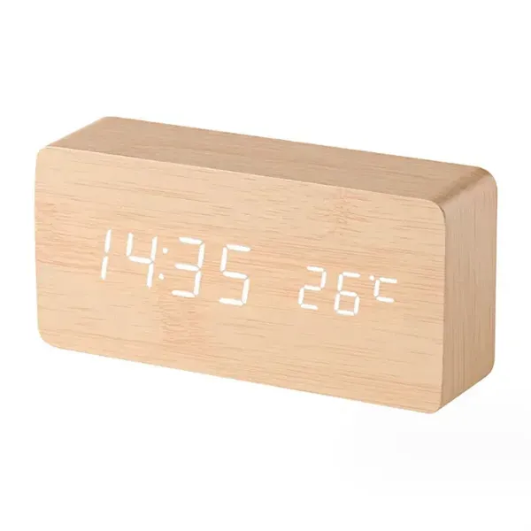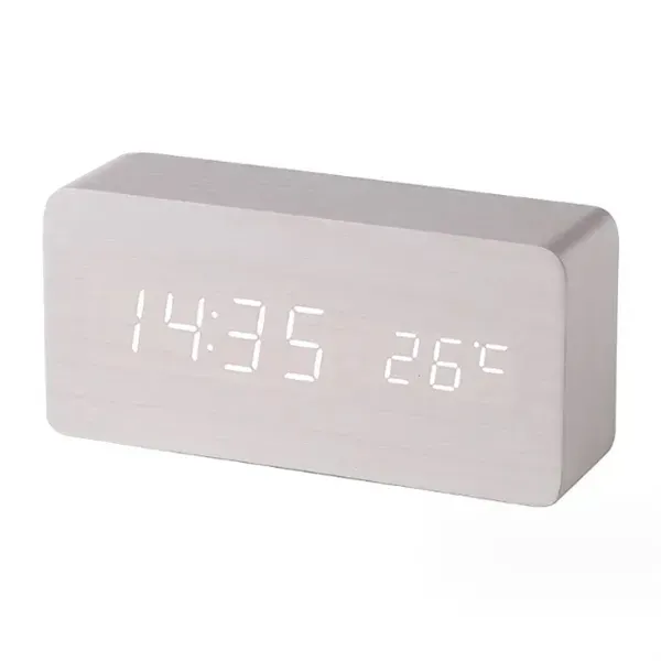 This multifunctional digital clock is constructed with MDF and PVC material. It displays both time and temperature on the screen simultaneously. The clock features a sound control mode (Power-saving mode), where the screen turns off after 10 seconds, and you can light it up by clapping your hands. It allows you to set up to 3 alarms and can be powered by either 4 AAA batteries (not included) or via USB. The clock complies with CPSIA regulations and measures 5.9" in length, 2.8" in width, and 1.6" in height.